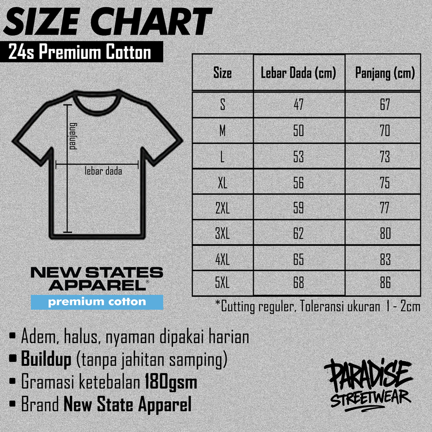 Spesifikasi dari kaos New States Apparel antara lain Single stitch dengan rib leher 2.2cm, chain stitch pada bagian pundak dan tubular constuction atau built-up tanpa jahitan samping.